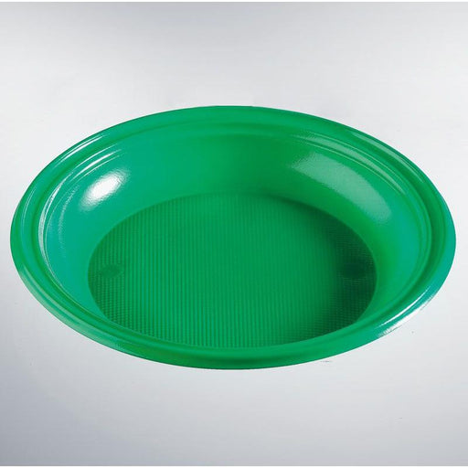 Confezione da 30 piatti fondi in plastica color verde bandiera; il piatto ha in diametro di 22 cm per un peso di circa 13 grammi.