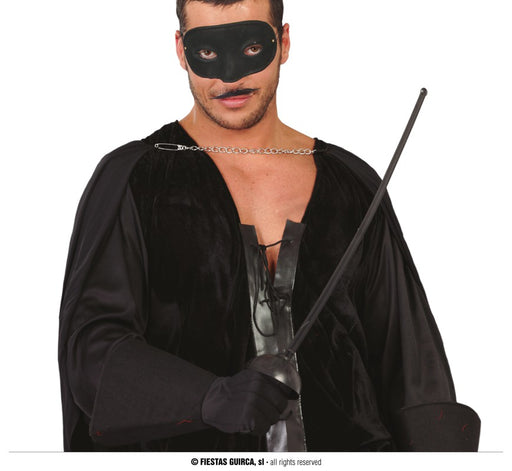 Presentiamo il set per il perfetto spadaccino, o uomo mascherato. Il set è composto da mascherina nera scamosciata, con elastico a tergo e dall'imm...