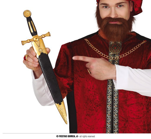 Elegante spada medievale realizzata in plastica rigida, con finiture dorate. La spada è dotata anche di fodero. Anche l'elsa è completamente dorata...