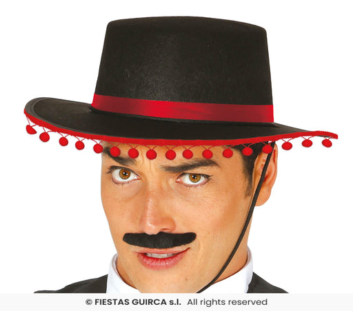 Sombrero Messicano El Dia De Los Muertos di colore rosso è un accessorio irresistibile. Adornato con passamanerie dorate e pon pon neri, questo som...