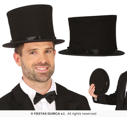 Trova il tuo stile unico con il nostro cappello da uomo in raso nero. Altezza di 21 cm per un look stravagante e travolgente. L'accessorio perfetto...