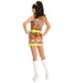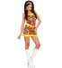 Colori sgargianti per questo costume da ragazza hippie realizzato in velluto; oltre l'abito con una evidente bordura gialla, nella confezione troverai anche la fascia per la testa e la cintura, entrambe in giallo.