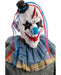 Maschera da clown pazzo omicida. E' realizzata in lattice di gomma e copre il viso e parte della nuca. Ha la particolarità di avere un minicilindro, sempre dello stesso materiale della maschera, e il naso colorato di azzurro. Sulla maschera sono attaccati anche i pochi capelli che sono rimasti al povero sanguinario omicida. Maschera in misura d'adulto.