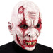 Terrificante maschera che ricopre sia la faccia sia la nuca, raffigurante un clown horror.Colore bianco della maschera che si mescola al rosso delle rughe, della bocca e degli occhi e ai denti aguzzi sporgenti. Clown sanguinario.