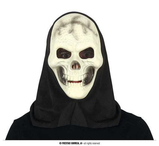 Lasciati stupire dalla maschera da teschio con cappuccio! Realizzata in plastica rigida e con un cappuccio di tessuto nero, questa maschera è l'acc...