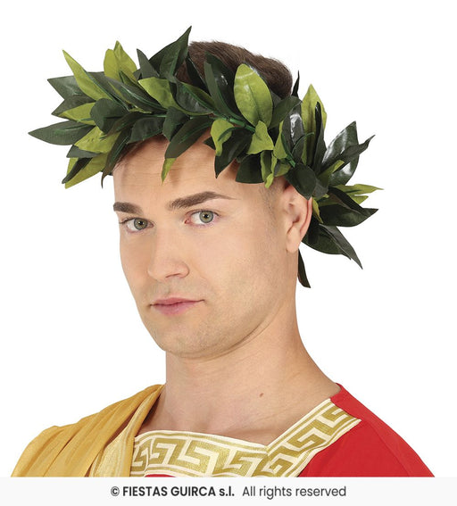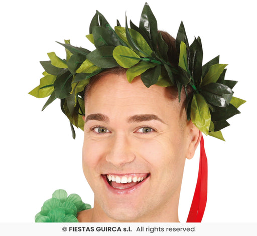 Corona in alloro verde con foglie plastificate dotata di elastico interno per essere calzata su diverse misure di testa. Ideale per laureati ma anc...