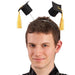 Cerchietto con 2 cappelli da lureato, il classico tocco, sulla parte superiore. La particolarità molto carina è data dal fatto che questi cappellini sono montati su delle molle, quindi ad ogni movimento della testa, vanno da tutte le parti. Rifiniscono il tutto due nappine di colore giallo.