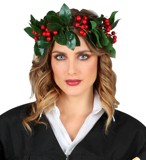Corona d'alloro per la laurea in formato deluxe. E' piena di bacche rosse tra le diverse foglie, che sono realizzate in plastica. La coroncina si a...