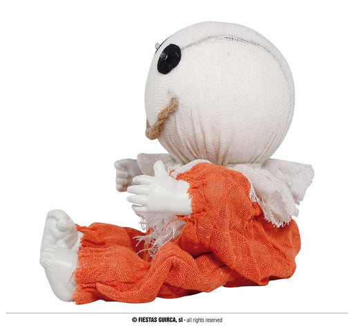 Piccolo spaventapasseri in modalità Halloween. L'articolo ha un'altezza di cm 25 essendo seduto. Lo spaventapasseri ha un bottone che, una volta pi...