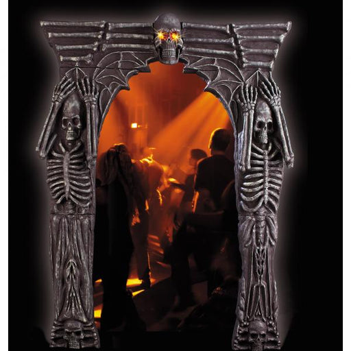 Una splendida decorazione di Halloween che riproduce un misterioso e lugubre portale, sorretto da scheletri. Al centro è presente un teschio con gl...