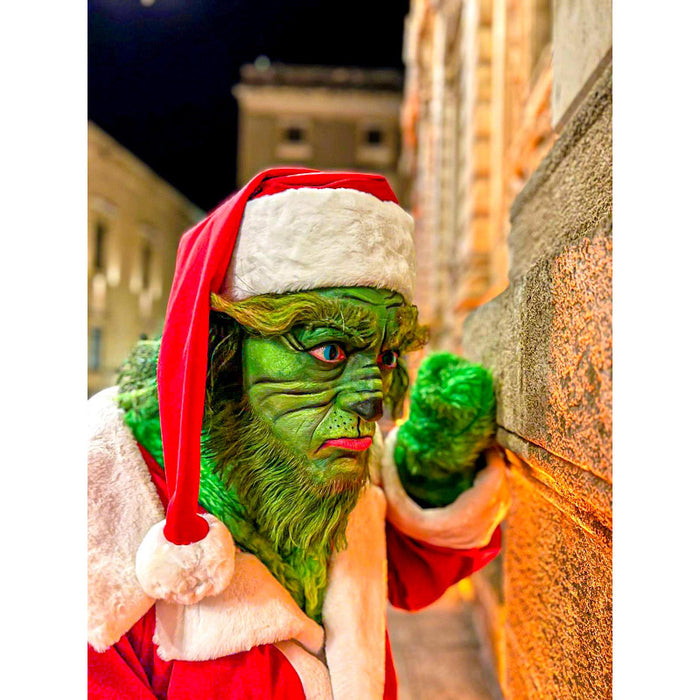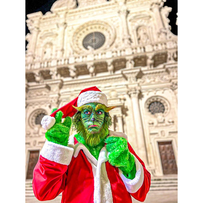 Costume realizzato all'interno della nostra sartoria teatrale. Tessuto in peluche di qualità, sapientemente cucito dalle nostre sarte, per realizzare il più classico dei personaggi...anti Natale. Il Grinch, conosciuto anche con il nome di Sgruntolo, è quel mostro con la pancia a forma di pera, gli occhi gialli e ricoperto da una folta peluria di colore verde su tutto il corpo, che si diverte a rubare il Natale agli abitanti di Nonsochi. Odia l'allegria che le feste natalizie portano, non sopportando questa tradizione. Il nostro costume è composto da una giacca e dai pantaloni. Il colore è un verde chiaro. Sul nostro store Divertilandia.it, potrai trovare anche due tipologie di maschere del Grinch. Puoi scegliere se acquistare la versione con giacca di Babbo Natale, o senza giacca. La versione con giacca comprende: giacca rossa, cappuccio rosso, copriscarpe rosse, giacca verde, pantaloni verdi e guanti verdi, tutto in peluche. La versione senza comprende: giacca verde, pantaloni verdi e guanti verdi. La maschera, in tutte e due le versioni non è inclusa, ma deve essere acquistata a parte, sempre sul nostro store..