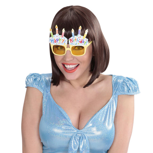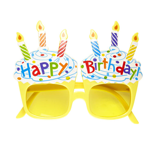 Spiritossissimi occhiali con due torte di compleanno sagomate sulle lenti. Scritta coloratissima Happy Birthday. Struttura in plastica di colore gi...