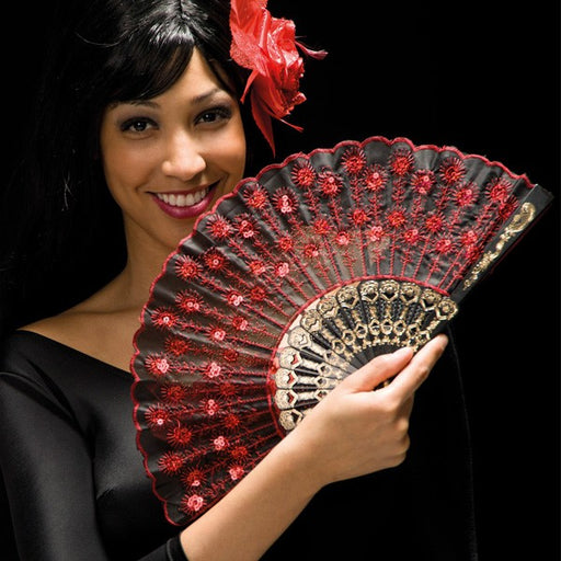 Fantastico ventaglio in tessuto di colore rosso. Uno splendido gadget per completare il travestimento in mille occasioni, feste di Carnevale o Hall...