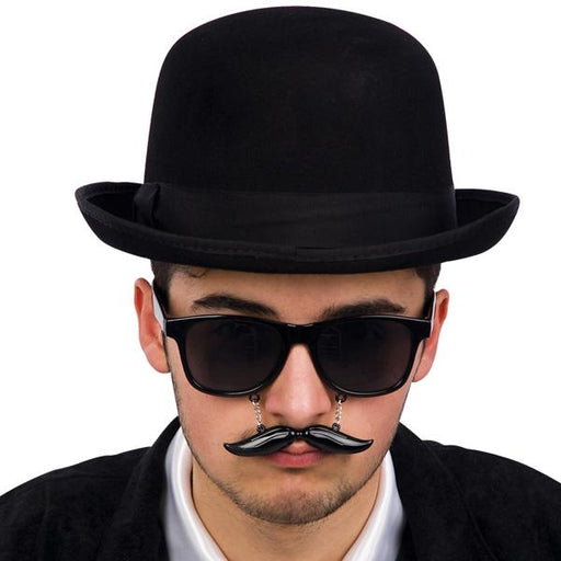 Occhiali neri di plastica con lenti nere. Le lenti hanno protezione uv400. Attaccati agli occhiali c'è un paio di baffetti in plastica.