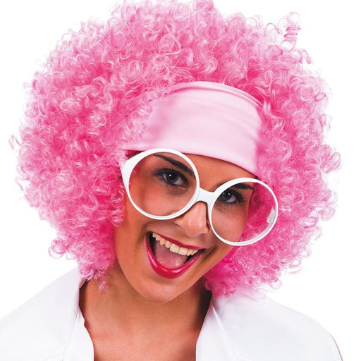 Occhiali realizzati in plastica di colore bianco. Le lenti hanno una forma tonda e anche loro sono di plastica.