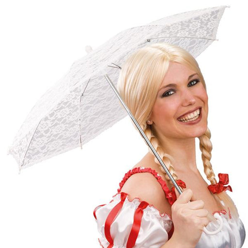 Ombrellino in pizzo bianco con pois bianchi. da abbinare a costumistica d'epoca. Dimensione diametro ombrello aperto centimetri 70. Altezza cm.50.