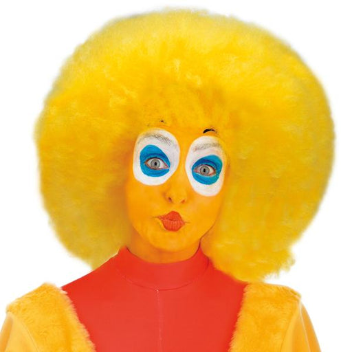 Parruccone di colore giallo per assomigliare al famoso pulcino pio, tormentone dei balli sfrenati dell'estate scorsa. Adattabile a qualsiasi misura...