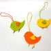 Tre mini uccellini primaverili da usare come decorazioni. Sono realizzati in feltrino e hanno la particolarità di poter essere usati all'esterno, anche sotto la pioggia. Sono di tre colori: giallo, arancio e verde. Ognuno ha il colore delle ali, che sono a forma di cuore, del colore di un altro uccellino, come si vede dall'immagine. Hanno un filino per poter essere appesi. Dimensione: centimetri 7.