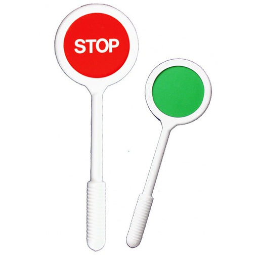 Paletta da poliziotto in plastica con lunghezza di 35 cm; impugnatura ergonomica con dischetto verde da un lato e rosso con la scritta STOP nell'al...