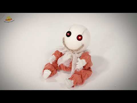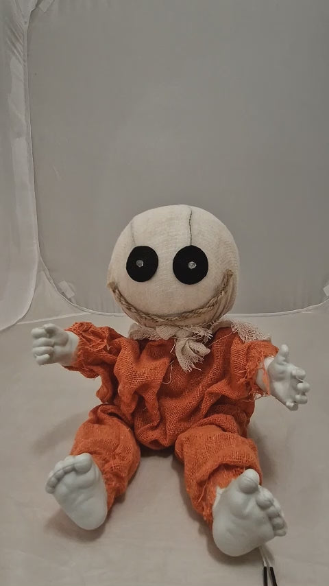 Piccolo spaventapasseri in modalità Halloween. L'articolo ha un'altezza di cm 25 essendo seduto. Lo spaventapasseri ha un bottone che, una volta pigiato, farà iniziare i movimenti, le luci ed i suoni. Si potranno udire risate lugubri, lo spaventapasseri sobbalzerà e gli occhi si illumineranno di rosso. Un terrificante gadget per il tuo Halloween.
