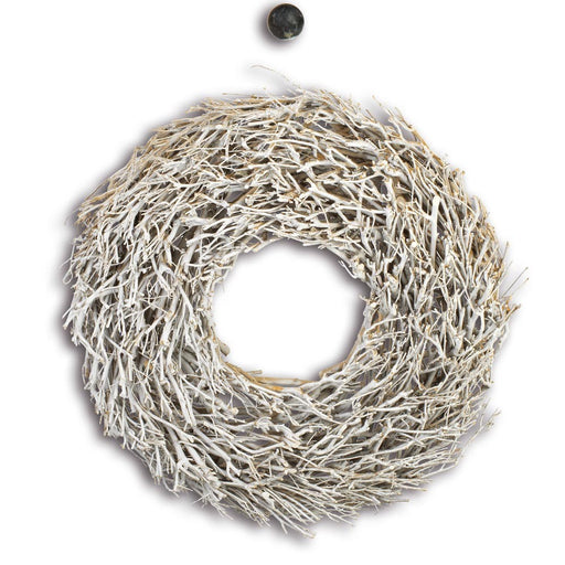 Corona realizzata con rametti intrecciati di colore bianco. Grandi dimensioni, con un diametro di centimetri 80. Perfetta per una parete grande. Dà...