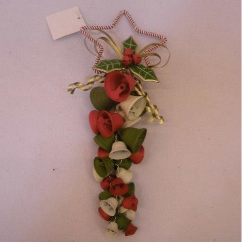 Pendente decorativo composto da una stella in metallo rivestita, agrifoglio in latta , e tante campanelline in metallo colorate di bianco, rosso e ...