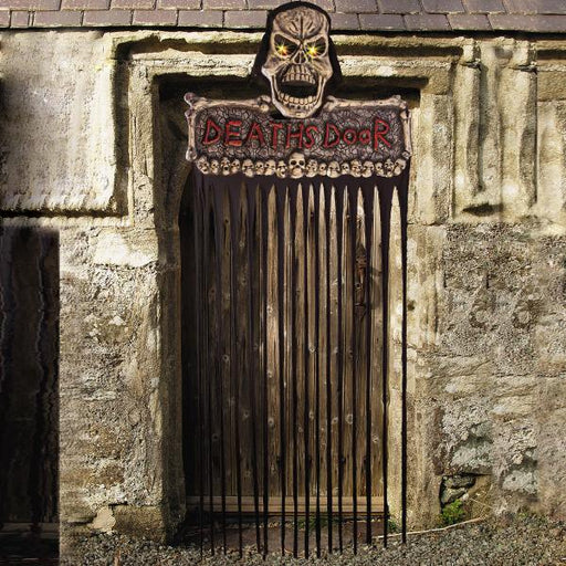 Decorazione di Halloween da applicare sulla porta. Dotata di scheletro con occhi luminosi e scritta inquietante. Larghezza 190 centimetri per 270 i...