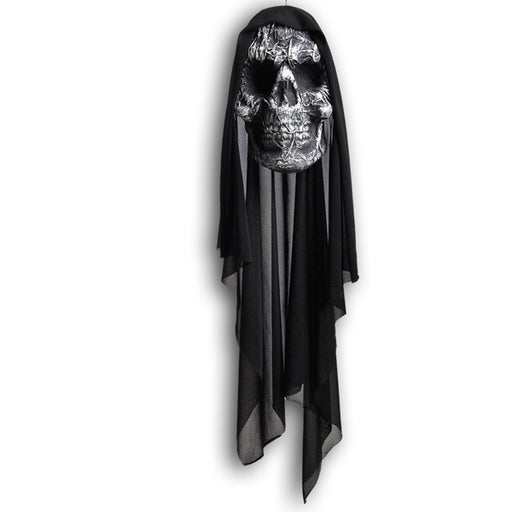 Dimensioni enormi per questa agghiacciante testa di scheletro con cappuccio. E' alto centimetri 82. Con cappuccio e tessuto stracciato.