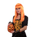 Tipica colorazione per una parrucca di Halloween: l'arancione. Ricorda da molto vicino le zucche che vengono poste al di fuori delle case, durante la notte più tetra dell'anno. La candela, o piccola lampadina, che viene posta all'interno della zucca, rappresenta la voglia di uscire fuori dalle tenebre. Parrucca lunga e liscia con frangia. Taglia unica da donna, con retina elasticizzata interna, per aderire con facilità alla circonferenza della testa.