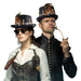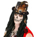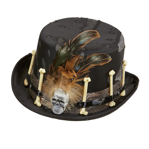 Coloratissimo cilindro modello steampunk. E' presente una fascia di raso nero dove sono fissate delle ossa e un teschio. Perfetto per travestirsi da negromante voodoo. Dimensioni: circonferenza centimetri 58. Taglia standard da adulto.