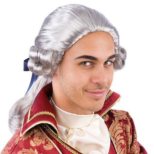 PARRUCCA MODELLO CAVALIERE GRIGIO CON NASTRO PER LEGARE LA CODA.SI ADATTA A QUALSIASI MISURA DELLA TESTA GRAZIE AL RETINO ELASTICIZZATO ALL' INTERN...