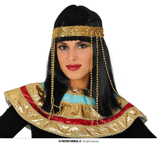 Classica parrucca da regina egiziana di colore nero corvino e realizzata con fibre sintetiche. La parrucca è lunga quasi fino alle spalle ed è dota...
