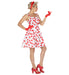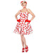 Il motivo delle ciliegie rosse disegnate sopra il tessuto è assolutamente ricorrente sui vestiti degli anni '50. Il tessuto di questo vestito è completamente bianco e sopra sono disegnate tante coppie di ciliegie. La gonna è vaporosa grazie all'ausilio della sottogonna. Questo stratagemma sartoriale viene utilizzato per dare maggiore risalto alla parte bassa del costume, ovvero alla gonna stessa. Abbiamo a disposizione una taglia: M da donna. Il costume si chiude grazie ad una zip posta sulla parte posteriore del vestito.