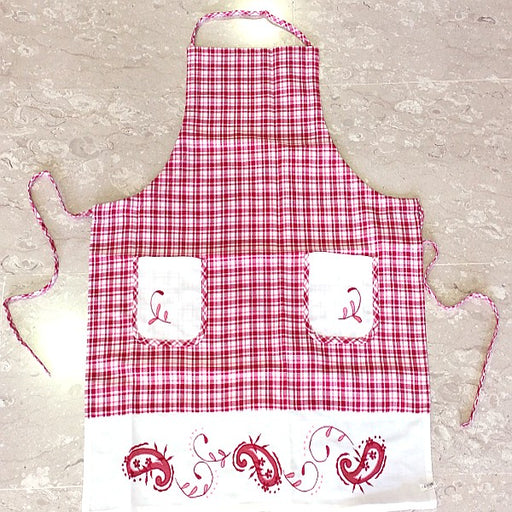 Grembiule in cotone in taglia unica. Finemente decorato. Colore bianco panno e bordeaux con fiori e quadri.