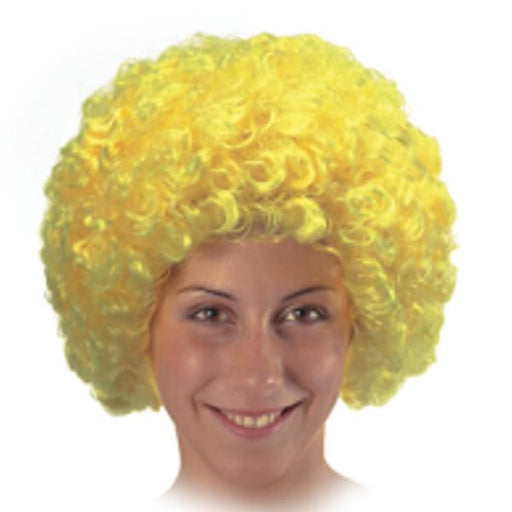 Parrucca riccia gialla con folti ricciolini, di ottima qualita', con retina per capelli interna elasticizzata. Peso grammi 90. La retina elasticizz...