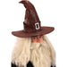 Più che di colore marrone, ci piace immaginare questo cappello da stregone, di colore ruggine, che dà l'idea di qualcosa di antico ed utilizzato tantissime volte. La particolarità è quella di essere modellabile, soprattutto la falda e la punta stessa. Questa operazione è resa possibile, grazie ad un'anima di ferro, posta all'interno del cappello stesso. E presente, sulla parte inferiore del cappello stesso, una fibbia che cinge tutta la circonferenza. L'altezza del cappello è di centimetri 44.