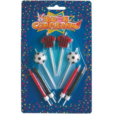 Confezione contenente 8 candeline per i veri tifosi del milan. diverse forme: 2 candeline rappresentano le t-shirt del milan, 2 palloni da calcio, 2 candeline nere e 2 candeline rosse. dimensione cm. 6