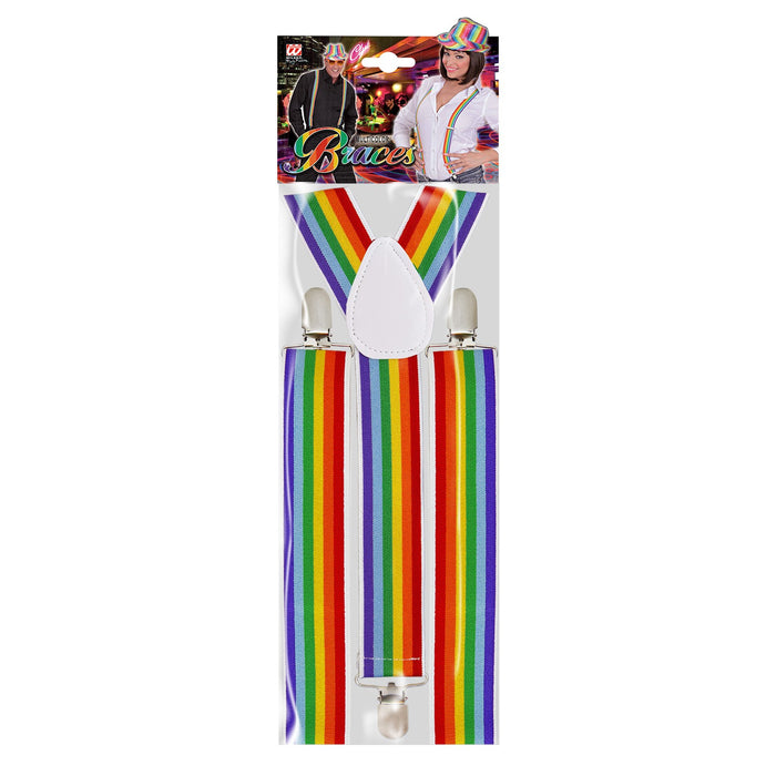 Bretelle elasticizzate con strisce di colore che ricordano i colori riprodotto in cielo dall'arcobaleno. Questi colori sono il simbolo universalemente riconosciuto per la pace e l'amore universale. E' un simbolo che è stato fatto proprio delle manifestazioni per l'orgoglio gay. Durante le diverse sfilate in giro per il mondo, si possono vedere uomini e donne indossare qualcosa che ricorda questi colori. Le bretelle che proponiamo sono interamente realizzate in poliestere elsticizzato. Semplici da indossare grazie ai tre fermi metallici che si fissano sul pantalone. Misura standard, visto che sono molto elasticizzati, possono essere indossati sia da bambini, che da adulti.