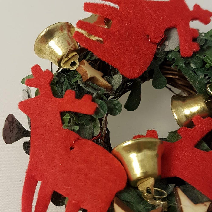 Ancora una coroncina natalizia con stelle in legno, campanelline dorate in metallo, renne rosse in tessuto con verdura verde a completare il tutto. Diametro esterno 11 cm cn parte centrale forata per poter applicare una eventuale candela.