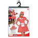 Costume da cameriera dei mitici american cafe degli anni 50, dove in modo molto seducente ti veniva versato una bella tazza di caffè assieme ad una fetta di torta ai frutti di bosco. Il costume è realizzato in poliestere. Il tessuto ha una base di colore rosso, con strisce verticali di colore bianco. La gonna è doppiata grazie alla sottogonna, per questo risulta vaporosa. Grembiulino che scende sotto la cintura, come si vede nell'immagine. La spilla da appuntare sulla parte alta del vestito, sulla parte sinistra. Il foulard da legare al collo e il copricapo del medesimo motivo del vestitino. I mitici anni 50, quelli dei drive in all'aperto, riprenderanno vita! Abbiamo a disposizione una taglia s da donna. Il costumino è a maniche corte.