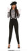 Costume composto da pantaloni, bretelle, t-shirt e baschetto alla francese. I pantaloni sono di colore nero, mentre la t-shirt ha le righe orizzontali bianche e nere. Il costume è il classico travestimento da attore di cinema muto o mimo da starda. I guanti di colore bianco che si vedono in foto, non sono compresi all'interno della sacca porta abiti. Abbiamo a disposizione due taglie da donna: la M e la L.