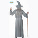 Sembra quasi il costume che veste il mago Gandalf, nel Signore degli anelli. Nella confezione troverai, la tunica, il cappello e la cintura. La cintura è q di corda colore beige. Il cappello è realizzato in gommapiuma leggera, ricoperta da poliestere. Poi è presente la tunica lunga, che arriva fino ai piedi. Il colore è il grigio che si tramuta in un verdastro, a seconda della posizione della luce solare. Abbiamo a disposizione solamente la taglia L da uomo. La confezione con cui il costume viene venduto è una busta con chiusura a zip. All'interno della confezione non è presente il bastone che si vede in foto.