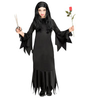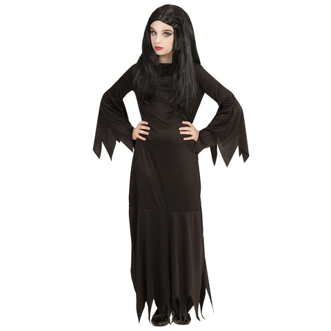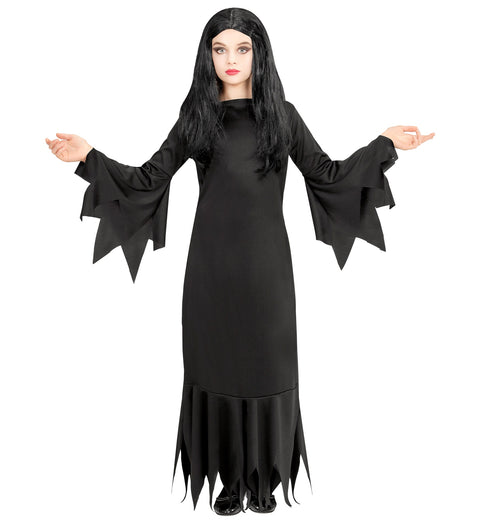 Semplice ma di sicuro effetto questo costumino da Morticia rispecchia l'originale della famiglia Addams, celebre personaggio dell'omonimo film e moglie di Gomez. Il costume in taglia da bambina è realizzato in tessuto di poliestere nero con manica sfrangiata e parte finale dello stesso sfilacciata.