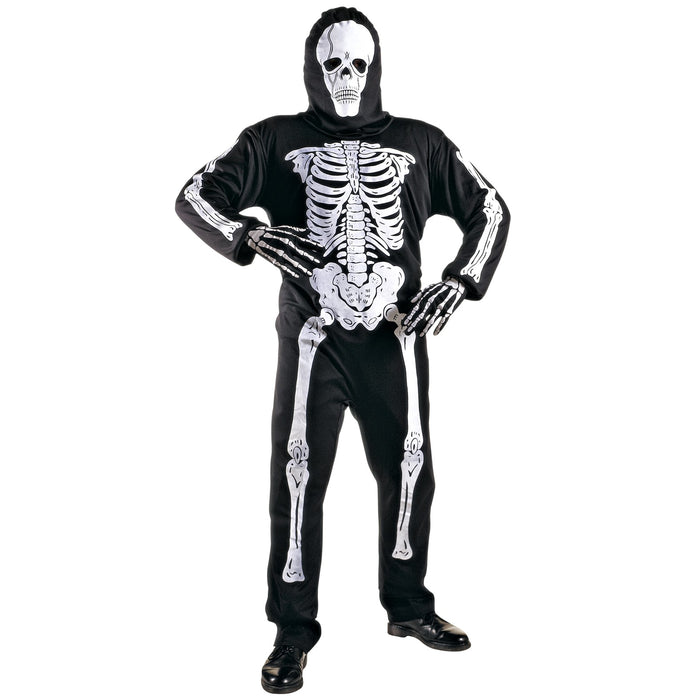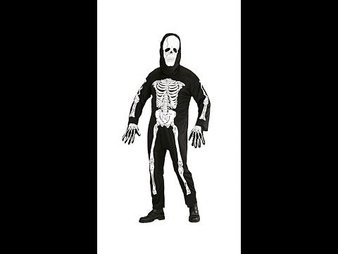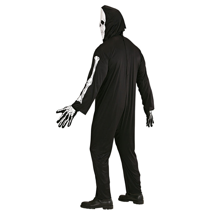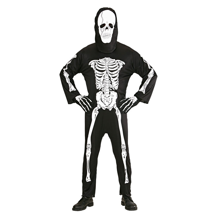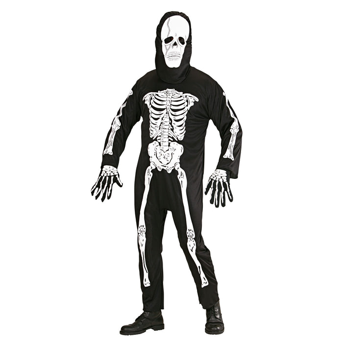 Tuta da scheletro in poliestere nera con ossa bianche stampate solo nella parte anteriore. Il costume è ideale per festeggiare la notte delle streghe ed è composto dalla tuta e cal cappuccio; sono esclusi i guanti venduti separatamente.