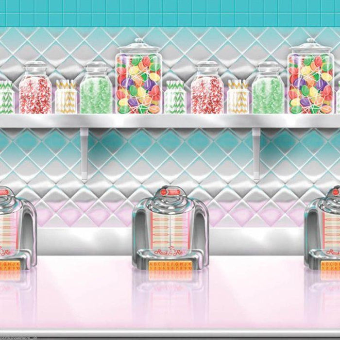 Ancora un fondale a tema anni 50; riproduce infatti un bar tipico di quel periodo. Questi fondali sono realizzati in pvc stampato, hanno un altezza di 122 cm per un lunghezza di 15,24 metri.Si possono attaccare alla parete con del nastro o con delle puntine da disegno.