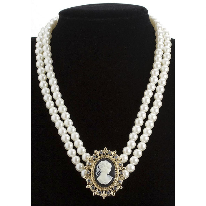 Particolare girocollo di perle (finte) con cameo, figura di donna impressa sul medaglione centrale. Perfetto accessorio per vestiti ricercati o abiti da sera.