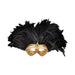 Maschera Veneziana con lunghissime piume nere modello Incas, basata su una elegante colombina in stucco dorato impreziosita dalla decorazione su sfondo bianco con note musicali. Maschera sobria, appariscente e al contempo elegantissima, per vivere il vero Carnevale di Venezia.