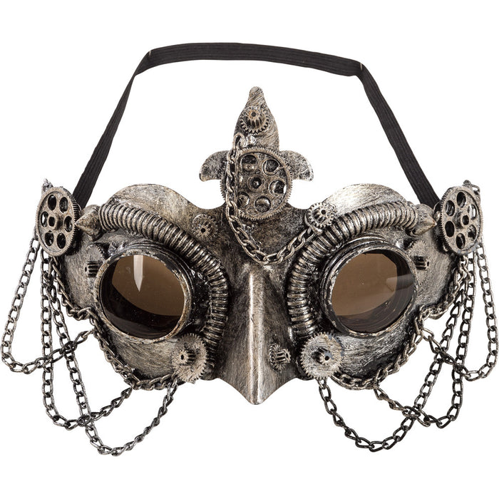 Maschera dal mood molto aggressivo. Già il fatti di possedere questo becco abbastanza pronunciato dà l'idea di quale tipo di maschera sia. La maschera modello steampunk è realizzzata in plastica rigida. Ha una particolare rifinitura simil metallo, che la fa apparire come una maschera di ferro. Come tutte le altre maschere steampunk è dotata di tanti inserti, ingranaggi, tubi e viti. La visione appare oscurata, grazie alle lenti fumè montate negli oculari. Maschera decisamente semplice da indossare, grazie ai due laccetti elasticizzati posteriori. Maschera steampunk che può essere indossata sia da uomini, sia da donne.