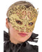 Maschera realizzata in tessuto gommato intagliato, di colore dorato con glitter. Maschera economica, ma di grande fascino visivo. Ha un elastico di colore nero a tergo, per poterla indossare con estrema facilità.. Sopra la parte degli occhi, gli intagli formano delle figure stilizzate. Maschera prettamente femminile. Misura da adulto.