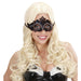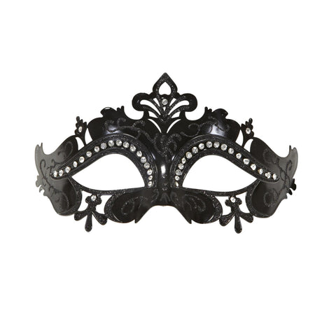 Bellissima maschera in plexiglass di colore nero tempestata di strass. Maschera di lusso da abbinare a costumi di carnevale ricercati e raffinati. Taglia standard, da indosare grazie al pratico laccio posto a retro della maschera stessa.
